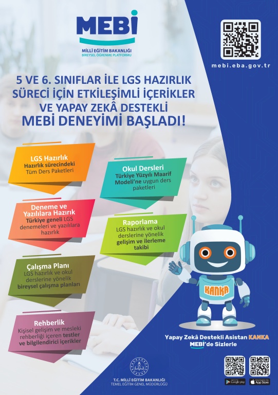 Öğrencilerimiz https://mebi.eba.gov.tr/ adresinden EBA hesapları ile giriş yaparak yapay zeka destekli bireysel öğrenme platformu MEBİ hizmeti kullanabilir. Türkiye Yüzyılı Maarif Modeli Öğretim Programları ve Liselere Geçiş Sistemi (LGS) çerçevesinde zenginleştirilen uygulama şimdilik 5, 6 ve 8'inci sınıf öğrencilerin kullanımına açılmıştır.